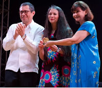 La escritora recibiendo la presea.
